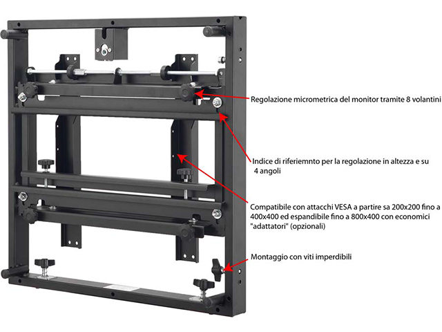 Le strutture autoportanti modulari sono l’ideale per noleggiatori e chiunque abbia necessita’ di utilizzare il videowall in momenti e configurazioni differenti. Realizzate in acciaio verniciato con polveri epossidiche. Montaggio e smontaggio rapido con viti a galletto imperdibili. Struttura rinforzata per montaggi e smontaggi ripetuti. Adatte principalmente per monitor da 46″- 55″- 60″. Installabili anche a filo vetrina, invertendo la base, in questo caso necessita l utilizzo di contrappesi. Per individuare la soluzione pi’ idonea e’ disponibile il configuratore videowall. Per strutture non presenti nel configuratore consultate il nostro staff tecnico. I monitor da 46″ devono avere le dimensioni: 1026×580 cm I monitor da 55″ devono avere le dimensioni: 1215×686 cm I monitor da 60″ devono avere le dimensioni: 1336×755 cm Portata massima: 50 kg/monitor.