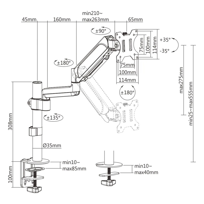 Supporto da tavolo a colonna con braccio a gas 3 snodi che permette di regolazione dell’altezza e dell’inclinazione del monitor in modo rapido e ottimale.