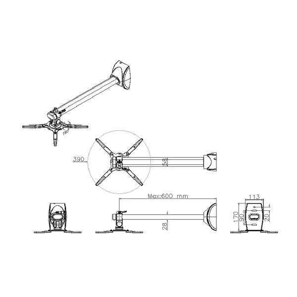 Supporto da parete in alluminio leggero dotato di sistema di fissaggio universale che lo rende compatibile con la maggior parte dei videoproiettori ad ottica corta e ULTRA CORTA